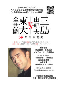 ■内容:豊島圭介監督『三島由紀夫vs東大全共闘 50年目の真実』を上映後、豊島圭介監督とTBSプロデューサ刀根鉄太氏をお招きし、制作意図や社会的インパクトについて、本学同窓の皆さんと共に議論を行います。